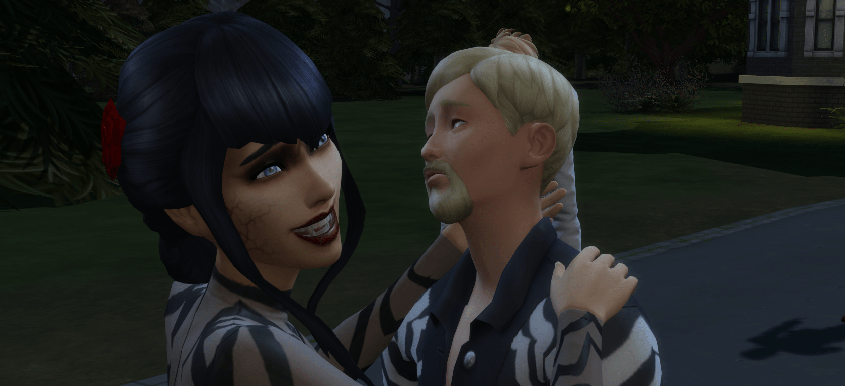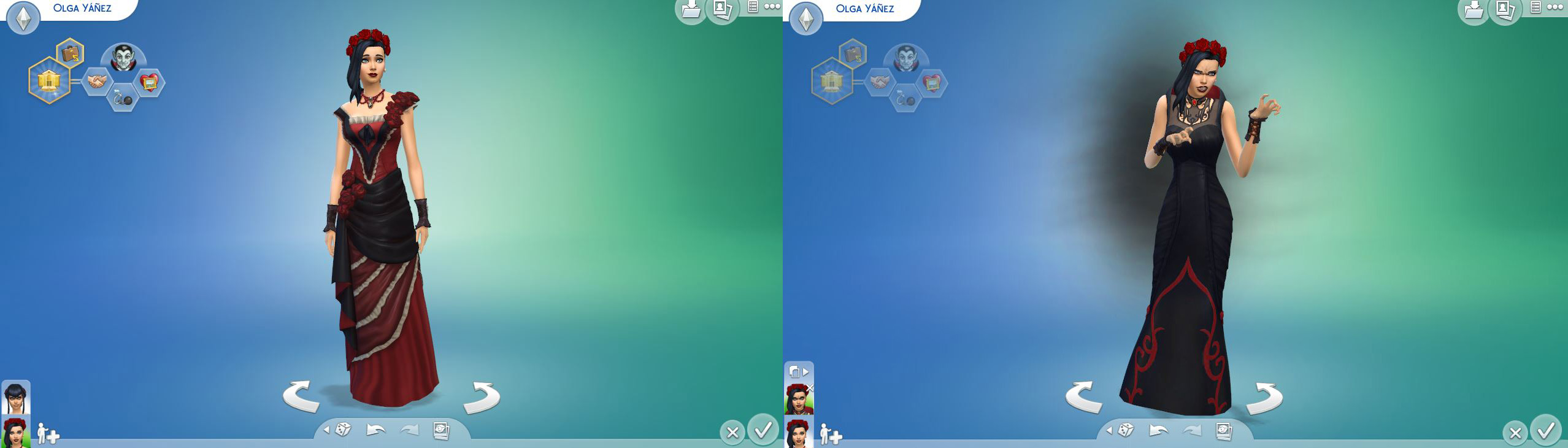 Al igual que con los alienígenas, los vampiros presentan dos cuerpos: forma humana y forma vampírica. No obstante, a diferencia de estos, no estamos restringidos a que una de ellas sea más vampírica y la otra más discreta, eso ya es algo que obedece más a los gustos del jugador. Independientemente de cuál estemos personalizando, encontramos nuevos y brillantes ojos, marcas para el rostro -mejillas agrietadas, ojos con ojeras profundas…- y unas cuantas dentadura con unos colmillos de impresión. Además, esta personalización no sólo se restringe a adultos, sino que es apta para todos los estadios de la vida de un sim, incluyendo los recientes infantes.
