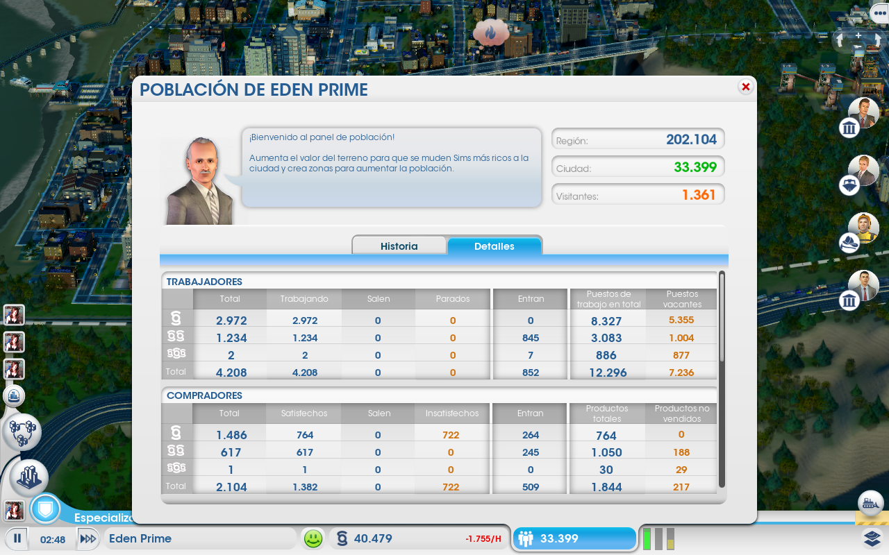 El planteamiento es sencillo: construye una cuidad que triunfe, y que comparta recursos con las vecinas. Pero a partir de ahí, todo son problemas. Hay que construir viviendas, que necesitan energía, agua, tratamiento de aguas residuales y recogida de basuras. Además, sus habitantes quieren tiendas y parques, e industria para trabajar. Alcanzar el equilibrio es realmente difícil, y siempre me termino encontrando en callejones sin salida: los Sims se quejan de que no tienen tiendas, si las pongo, no hay trabajadores o compradores, si no las pongo, se enfadan y se van, por lo que hay menos trabajadores y compradores. La industria se queja de la falta de trabajadores, pero el nivel de paro es altísimo entre la clase baja y alta, o no hay gente cualificada, aun teniendo varias universidades en la región con diferentes facultades, y una escuela técnica -como poco-, en cada ciudad.