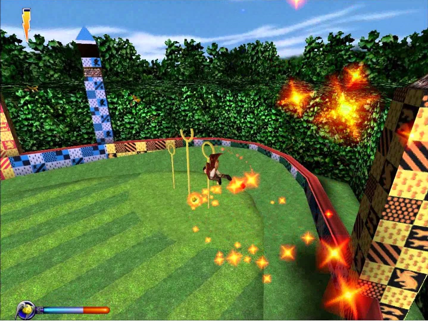Pero para mí lo mejor de este juego no era la adaptación de La Piedra Filosofal, ni las voces de los personajes, ni los desafíos. Lo que de verdad disfrutaba era el Quidditch, que más que un minijuego, era un segundo juego dentro de la aventura de Harry Potter. Tras asistir a las dos clases de vuelo -en la primera nos enseñaban los controles, mientras que en la segunda nos enfrentábamos a Malfoy por la recordadora-, jugábamos nuestro primer partido, en el que teníamos total libertad para movernos por el campo. Mientras evitásemos las Bludgers y chocar con otros jugadores, Harry podía tirarse horas volando en persecución de la Snitch, que tampoco es que fuera muy difícil de localizar. Pero había algo mágico en ello, algo que me hacía disfrutar enormemente de la posibilidad de participar en un partido, aunque estuviera tan limitado. Además, una vez superado el primer enfrentamiento -creo que era contra Ravenclaw-, podías participar de manera independiente en el Torneo, desde el menú principal. Y además, atrapar la Snitch no siempre te hacía ganar el partido, el contador cambiaba conforme pasaba el tiempo, y en alguna ocasión llegue incluso a no ganar la copa de Quidditch.