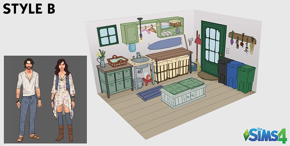 Después se inició otra votación para decidir el estilo gráfico, en la que los artistas gráficos de Maxis presentaban unas cuantas propuestas conceptuales de lo que podríamos ver en el pack. Los usuarios de Los Sims eligieron el estilo rústico para definir este DLC, lo que llevó a la siguiente encuesta, mucho más detallada: habría que elegir la ropa y objetos que aparecerían en él. Los diseños no salían únicamente de una lluvia de ideas de los desarrolladores, la comunicación entre ellos y los jugadores era diaria a través de los foros oficiales, donde había un hilo dedicado al desarrollo de este pack para recibir sugerencias de objetos, estilos, funciones… Las últimas decisiones fueron acciones exclusivas que podrían llevar a cabo nuestros sims o funciones para las nuevos objetos, el nombre del pack y el icono. Día de colada fue el ganador y, con ello, la idea de «vida ecológica» se terminó de disolver en la nada.