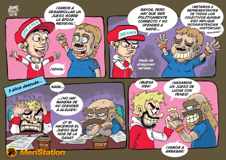 Como siempre, los defensores del juego han utilizado las palabras «rigor histórico» (medievo™) para desacreditar a aquellos que denunciaban la falta de diversidad. Lo cierto es que no soy historiadora, así que no quiero meterme en esta cuestión porque no tengo muy claro que pensar. Menciono la polémica de Kingdom Come: Deliverance porque ha desembocado en, de nuevo, debates sobre lo «políticamente [in]correcto». Esta mañana ha salido una nueva viñeta de «humor» (la tenéis sobre estas líneas) en Meristation de Jaume Font Rosselló, el mismo que hace un año publicó otra por el estilo sobre las «damsel in distress» y un Yoshi cabreado con las feministas. Ahora, ha hecho una viñeta sobre la «corrección política» con un humor rancio y una conclusión que mejor no defino (jijiji ha dicho pene, qué transgresor).