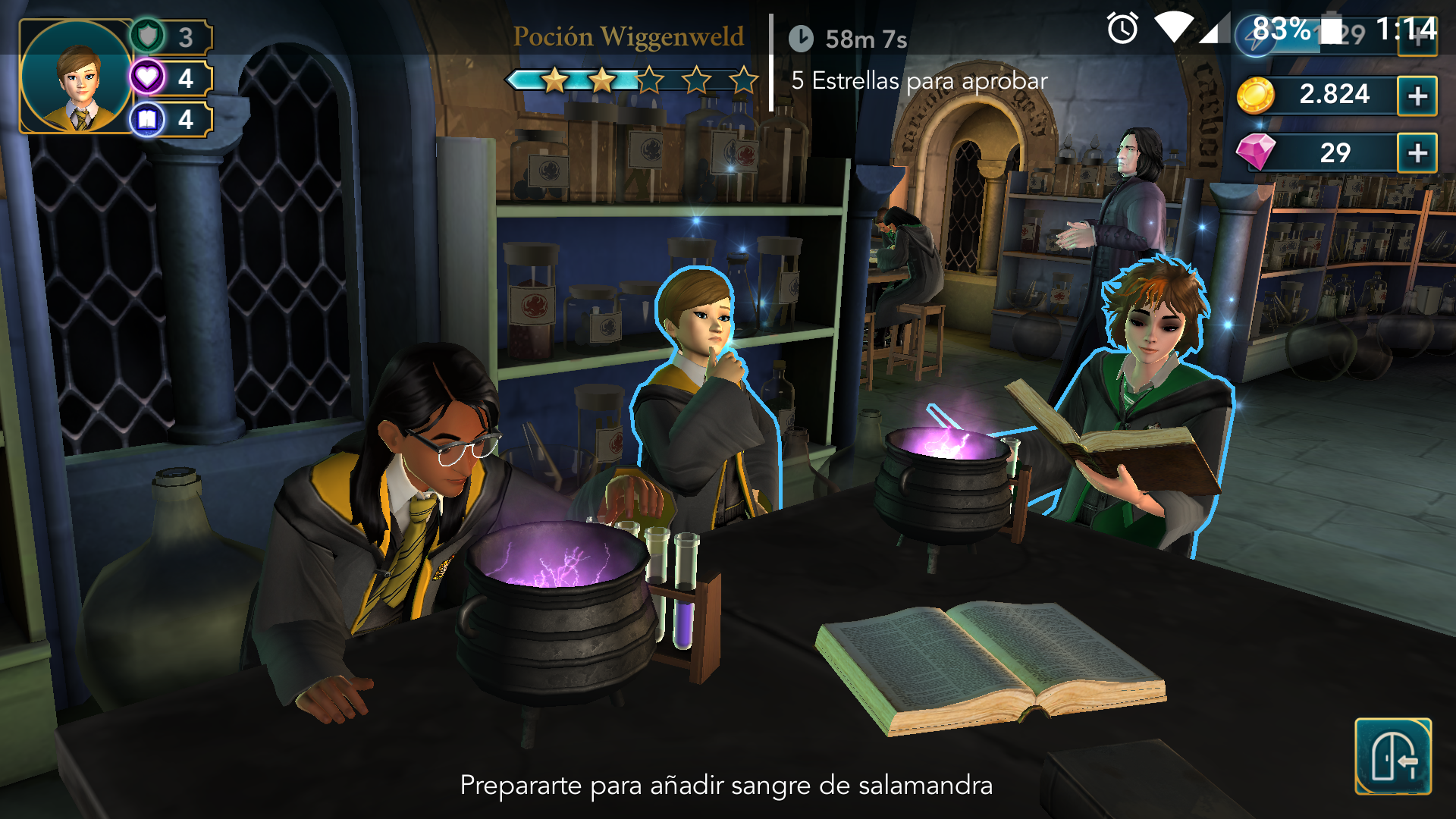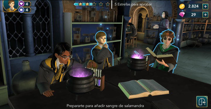 La historia está estructurada por capítulos, que se irán desbloqueando según los completemos (obviamente) y asistamos a clases para aprender hechizos y pociones, pues no debemos olvidar que somos alumnos de primer año y descubrir la verdad sobre un misterio de este calibre no se puede conseguir si todo lo que sabemos hacer es tirar chispas con la varita. Encantamientos con Flitwick, vuelo con la Señora Hooch o Pociones con Snape son las principales del primer año, y todas están basadas en el mismo planteamiento: tenemos un límite de tiempo para cumplir los objetivos de la clase, es decir, conseguir las estrellas mínimas para aprobar. Éstas se obtienen mediante la interacción con algunos elementos o personajes de la clase, pulsando sobre ellas el número de veces indicado, a cambio de un punto de energía por cada vez. Además, también se nos pedirá recorrer el dibujo del hechizo en cuestión con el dedo o tocar la pantalla en el momento justo para concentrarnos. Son clases más elaboradas que en los juegos de PC de Harry Potter, en el que el aprendizaje del encantamiento era sólo una fracción del desafío, aunque sí echo de menos que los dibujos no sean los mismos, o que el primer hechizo aprendido sea Lumos y no Flipendo.