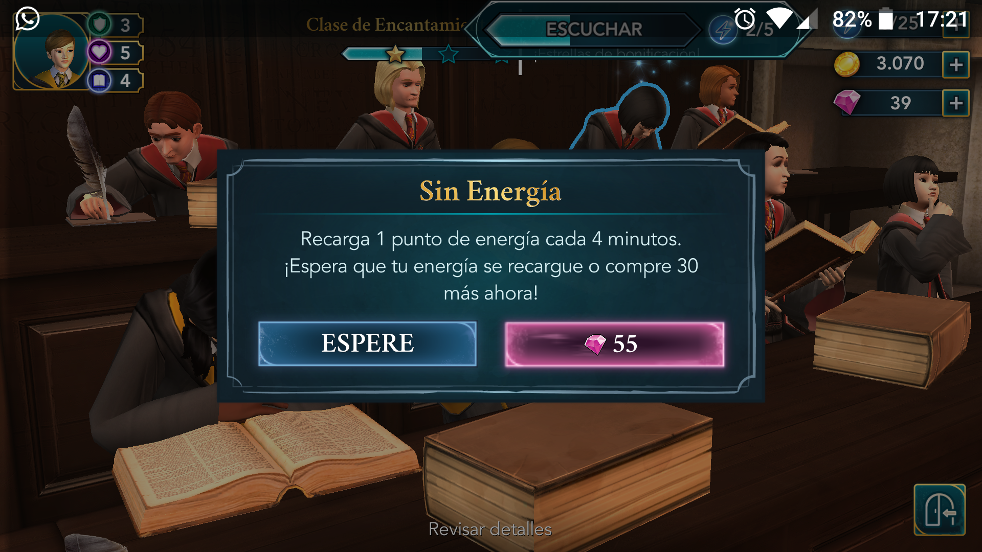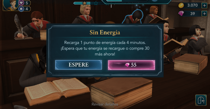 Obviamente no voy a pedir que me lo den todo regalado, hacer un videojuego cuesta tiempo y dinero, y las personas en el equipo de desarrollo deben recibir su sueldo. El problema es la manera en la que están introducidos los micropagos, al ser Hogwarts Mystery un free to play. Antes os he hablado de cómo debemos conseguir estrellas en un tiempo determinado para poder superar las clases. Para hacer debemos utilizar los 30 puntos de energía que tenemos, gastándose 1 con cada interacción que realizamos en la clase. Pero, y esto es lo importante, no todas las tareas de la clase te rellenan la barra de la misma forma: algunas necesitan 1 punto, mientras que otras 5, y hasta que no la completes no hay estrellas que valgan. Me ha pasado en demasiadas ocasiones ya que me he quedado a medias de una de estas tareas por falta de puntos de energía y diréis «no pasa nada, un poco de paciencia, como con Los Sims Móvil». Sí, procuro tener paciencia y esperar a que la barra se rellene un poco para seguir, pero cada punto requiere 4 minutos de espera, y mi tiempo es muy valioso como para quedarme con cara de tonta mirando la pantalla sin poder hacer nada. ¿Qué significa esto? Que si quiero la barra llena necesito esperar 2 horas, y en demasiadas ocasiones esto te pone en riesgo de no completar el desafío. Sin ir más lejos, la clase de encantamientos para aprender Nox la tuve que hacer tres veces (por esto y porque no me guardaba el progreso cuando salía de la partida para esperar a que se recargase la energía). El juego nos permite, por supuesto, utilizar un camino más rápido y llenar la energía de golpe, pero para ello necesitas diamantes rosas, que sólo se dan como recompensas y en la cantidad justa o bien se pueden comprar con dinero real. Además, también hay algunos objetos en los pasillos de la escuela que te proporcionan algunos puntos de energía, pero para encontrarlos es necesario no estar en un desafío, por lo que sólo sirve cuando ya los hemos terminado.