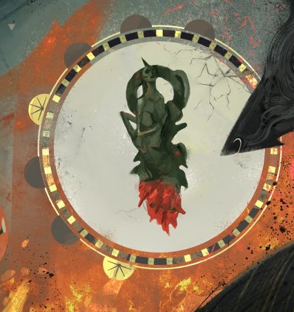 Para cerrar el análisis de la imagen, quiero centrarme de nuevo en el ídolo de lirio rojo del que os he hablado inicialmente. Parece que la figura misteriosa muestra o lanza la talla al lobo terrible encerrada en algún tipo de campo. ¿Podría significar que la manera de acabar con él es mediante el lirio rojo? Aunque no creo, porque Andruil se infectó durante sus visitas a los Forgotten Ones y lo único que consiguió fue más poder, volverse loca y poner en peligro el mundo de los elfos. Tengo que confesar que interpretar la iconografía de los frescos de Solas a veces me resulta complicada, pero por las cruces que aparecen en los semicírculos dorados, sería posible que se refiriera a los los foci (orbes como el de Corypheus, que pertenecía a Solas) que aún quedan en operativos (podéis compararlo con la representación de estos que aparecen en los frescos de Vir Dirthara).