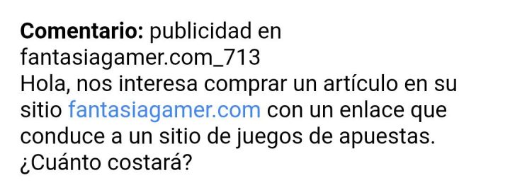 Fantasía Gamer es un blog pequeño. Empezó en el año 2013 como una manera de permitirme escribir sobre videojuegos siempre que quisiera, con el tono que me encajase y sin preocuparme de ninguna línea editorial. Pero lo más importante, sin el objetivo de convertirse en referente de nada. Cuál es mi sorpresa cuando, independientemente de la frecuencia de publicación, empiezo a recibir mensajes a través del formulario de contacto en el que me ofrecen comprar un artículo a cambio de enlazar a casas de apuestas. La cantidad de ofertas de este tipo ha llegado a un punto que en el formulario de contacto ya aviso de que no se molesten en escribir.