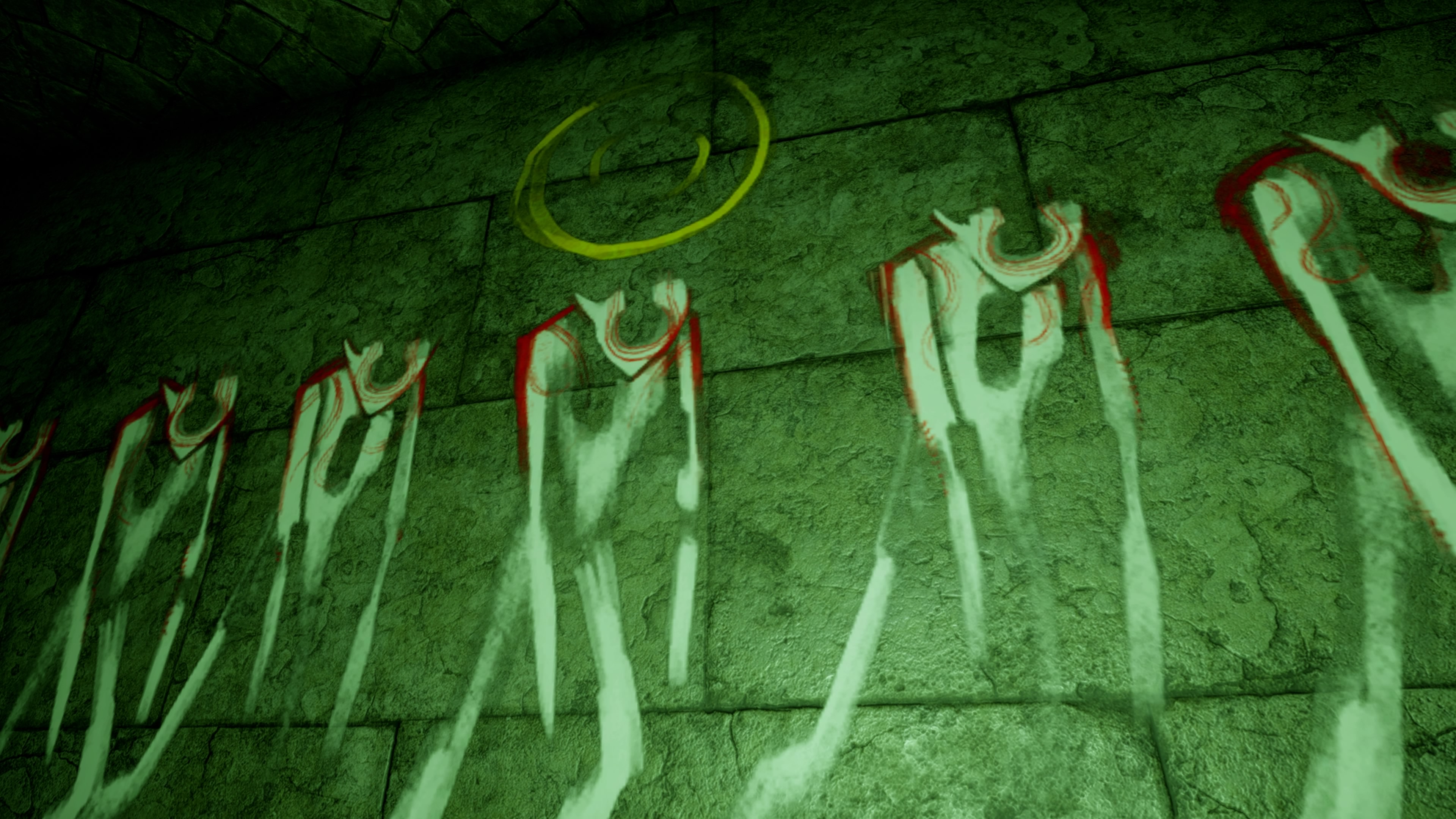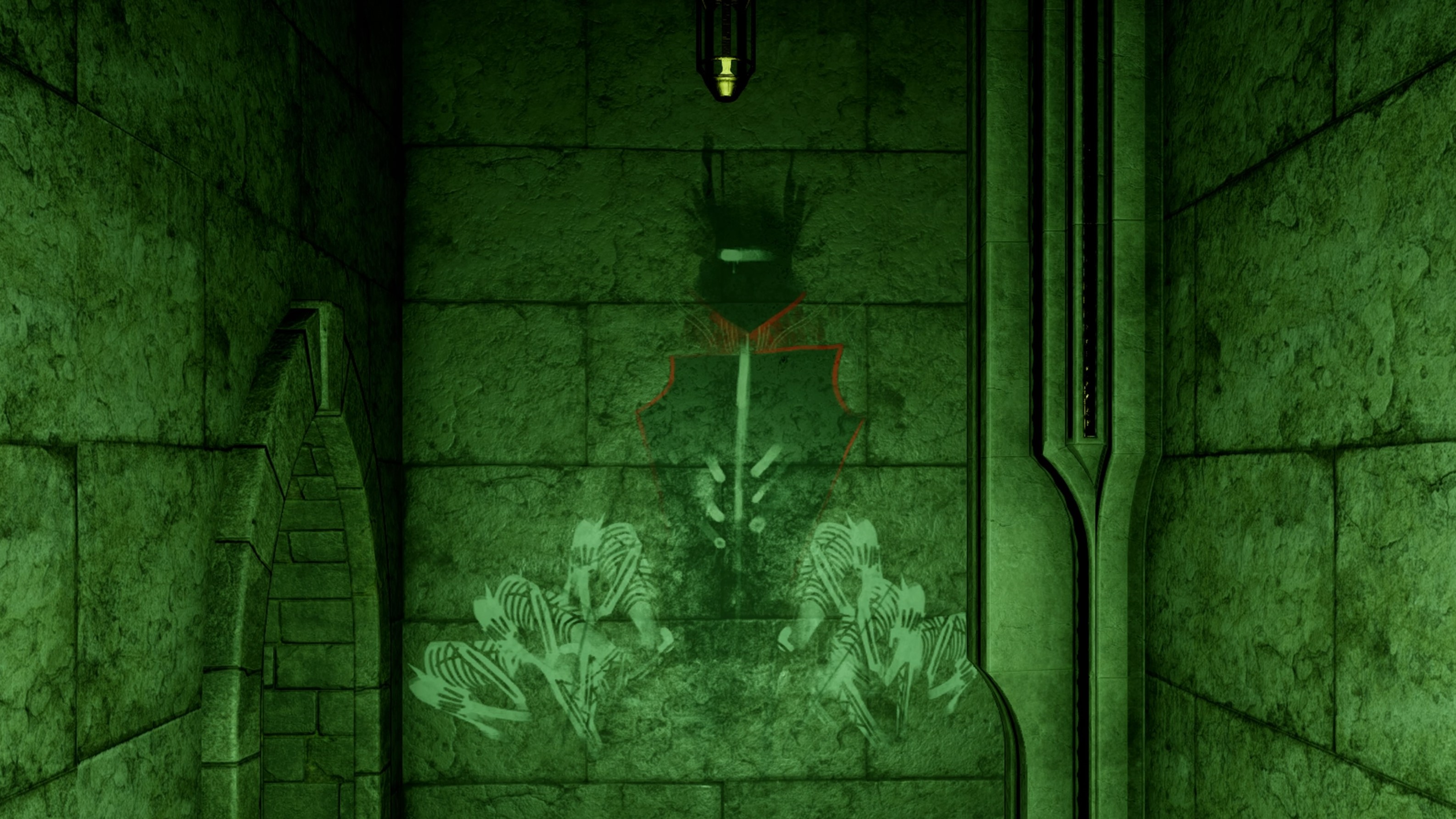 Una vez superada la batalla, se adentran en las profundidades del Thaig hasta que este cambia y empieza a mostrar grabados en sus paredes. Uno de los guardas, Lesha, se detiene a examinar uno de ellos y lo identifica como un suplicante, una sacerdotisa y un monstruo, mientras que su compañero indica que parecen pinturas élficas. De hecho, más adelante se afirma que de vez en cuando los Guardas encuentran ruinas élficas entre los thaigs enanos que recorren. En cada grabado, la imagen varía ligeramente en el suplicante y el monstruo, pero la sacerdotisa (o reina) parece mostrar una sonrisa cada vez más cruel. Más adelante del pasadizo aparecen nuevos grabados que muestran flores y criaturas jamás vistas y los últimos son especialmente reveladores: los mosaicos característicos del arte élfico parecían mostrar a los reyes y reinas de los elfos recibiendo a sus súbditos, un grupo de magos eliminando la enfermedad de sus suplicantes y unas hallas llevando a cuestas uno espectaculares araveles. Pero conforme se examinaban más grabados, la escena volvía a cambiar: las hallas se volvían monstruosas, los araveles parecían cárceles y los magos, bajo la atenta mirada de los dirigentes (los evanuris) imbuían a los suplicantes (los esclavos) con la corrupción. Recordad a Solas: «Had I not created the Veil, the Evanuris would have destroyed the entire world«.