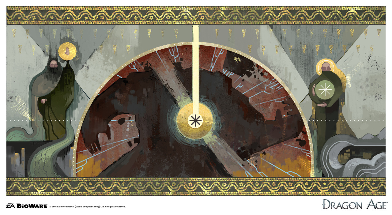 En las tres historias Solas busca hacerse con el ídolo (la tercera es la más surrealista de ellas) porque es parte fundamental del ritual y sin él no puede destruir el Velo. Eso es lo que nos muestra la imagen que tenéis sobre estas líneas. A simple vista vemos a Solas a la izquierda, el Lobo Terrible a la derecha y el ídolo de lirio rojo dentro de un círculo en el que solo dos esferas sigue iluminadas. Y en la escena, el mundo está en llamas (as this world burn in the raw chaos, I would have restore the world of my time… the world of the elves). Pero, ¿qué simboliza el círculo que rodea al ídolo de lirio rojo? Los Antiguos Dioses, los Archidemonios. En el tiempo en el que transcurre Dragon Age Inquisition han sucedido cinco ruinas y solo quedan Razikale y Lusacan por despertar. Las dos últimas esferas que quedan por apagar son los dos últimos sellos que permanecen intactos, pues los otros han sido destruidos con el fin de cada Ruina.